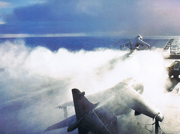 Für die kleineren Flachdeckkreuzer brauchte die Royal Navy ein Ersatzflugzeug für die schweren Trägergestützten Jagdflugzeuge. Als Ersatz bot sich eine Weiterentwicklung der Harrier an. Als wesentliche Änderung zum Harrier GR.Mk 3 besticht die Sea Harrier durch den völlig neu konstruierten Rumpfvorderteil und das um 28 cm erhöhte Cockpit. Die konstruktiven Änderungen waren für die Aufnahme des Blue Fox Radargerätes und einer komplett überarbeiteten Bordelektronik nötig. Die Sea Harrier kann mit kleinen Kampflasten senkrecht starten, ist mit normalem Abfluggewicht jedoch auf eine sehr kurze Startrollstrecke angewiesen.