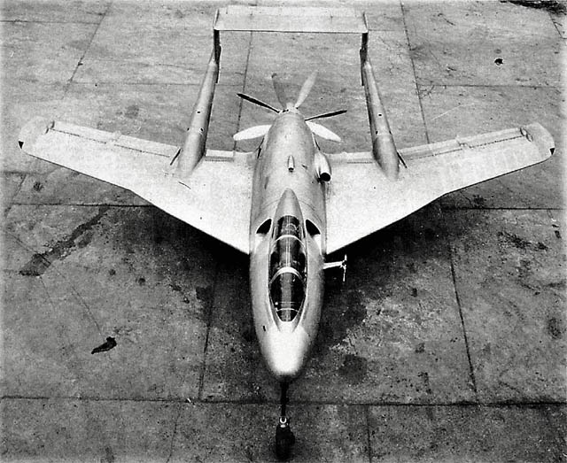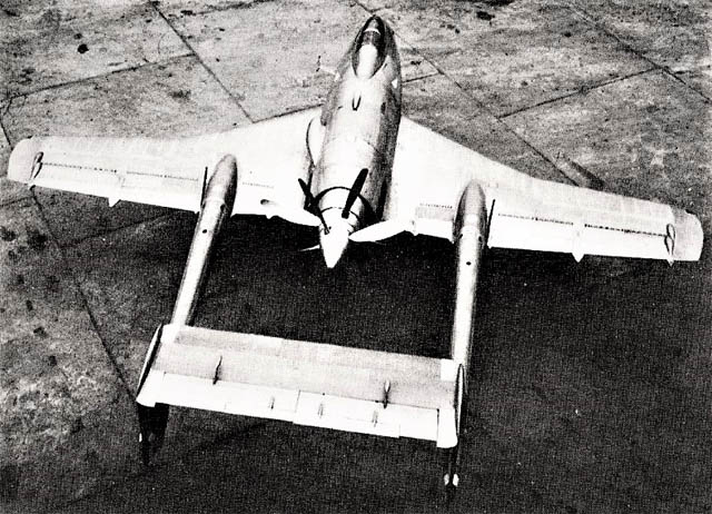 Bis zu den Leitwerksträgern waren auf jeder Seite noch ein Flächentank von 320 Litern Kapazität eingebaut. Die Flügelvorderkanten wiesen einen Pfeilwinkel von 33 Grad auf. An der Hinterkante befanden sich die Landeklappen, die mechanisch betätigt wurden. Die beiden Leitwerksträger mit einem ovalen Querschnitt waren als Ganzmetallkonstruktionen in Halbschalenbauweise ausgeführt. Am Ende befanden sich die beiden rechteckigen Seitenleitwerke, wobei diese über den unteren Rand der Leitwerksträger hinausreichten und am tiefsten Punkt je einen Gummipuffer trugen, um das Leitwerk bei zu steilen Startwinkeln gegen Beschädigung durch das Berühren des Decks zu schützen. Die Seitenruder waren Leichtmetallkonstruktionen mit mechanisch verstellbaren Trimmklappen. Das Höhenleitwerk verband die beiden Seitenleitwerke, es war oben auf diese aufgesetzt und ragte seitlich über diese hinaus. Das Höhenruder, ebenfalls eine Ganzmetallkonstruktion, war in der Mitte geteilt, aber durchgängig von Seitenleitwerk zu Seitenleitwerk. Die Trimmklappen waren asymmetrisch in ihrer Größe und ebenfalls mechanisch verstellbar. Das Fahrwerk war als Bugradfahrwerk ausgelegt, wobei alle drei mit hydraulischen Stoßdämpfern versehenen Fahrwerksbeine Einzelräder mit Niederdruckreifen hatten. Die Hauptfahrwerksräder wurden hydraulisch gebremst. Sie waren im äußeren Teil des Mittelflügels an den Holmen angeschlagen und fuhren nach Innen zum Rumpf zu in den Mittelflügel hydraulisch ein. Die Fahrwerksschächte waren mit großen Klappen verschlossen, die hydraulisch betätigt wurden.