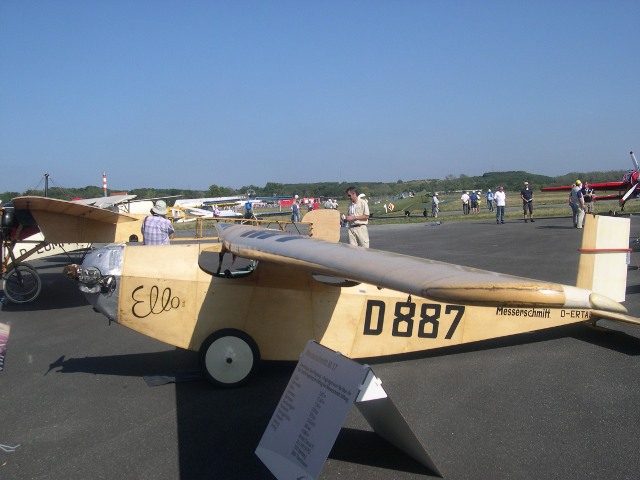 Er möchte noch eine Bleriot bauen, sagt er, aber es gäbe keine Originalmotoren mehr und die nachzubauen sei fast unmöglich. Er hat noch eine zweite Maschine mit nach Darmstadt gebracht, eine in Schweden in Lizenz gefertigte Focke Wulf Fw 44 „Stieglitz“. Später wird er etwas Kunstflug damit zeigen, sagt er, aber vorsichtig, denn die „Stieglitz“ gehört eigentlich seiner Frau. Gleich neben der Bleriot wird nun die M17 zum Start fertig gemacht, der Pilot, ich schätze ihn auf mindestens 1,85m Körperhöhe, schiebt sich einem Schlangenmensch gleich in den hinteren Sitz. Er hebt die Hand, der Propeller wird angeworfen und tuckert brav los. Heute hat manches Motorrad mehr PS, aber nach kurzem Rollen ist das Maschinchen in der Luft und zeigt seine Fähigkeiten.
